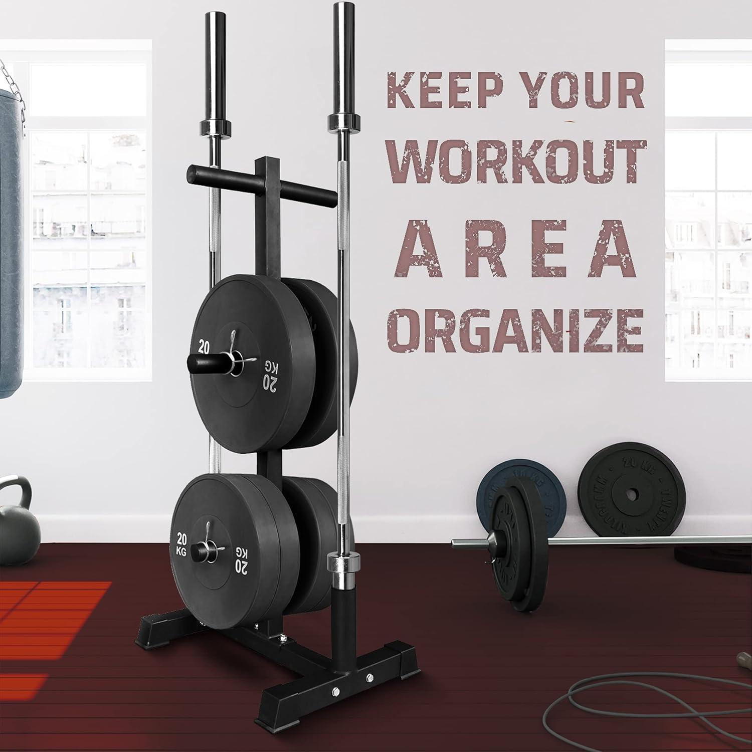 EASY AND EFFICIENT STORAGE FOR BARBELLS AND WEIGHT PLATES: Yes4All Weight Plate Tree Holder contains 6 pegs on both sizes, able to fix for all weight plate 2.5 lbs, 5 lbs, 10 lbs, 25 lbs, 35 lbs at the same time, which fits two inches Olympic weight plates, and two bar holders which fits two inches barbell bar.