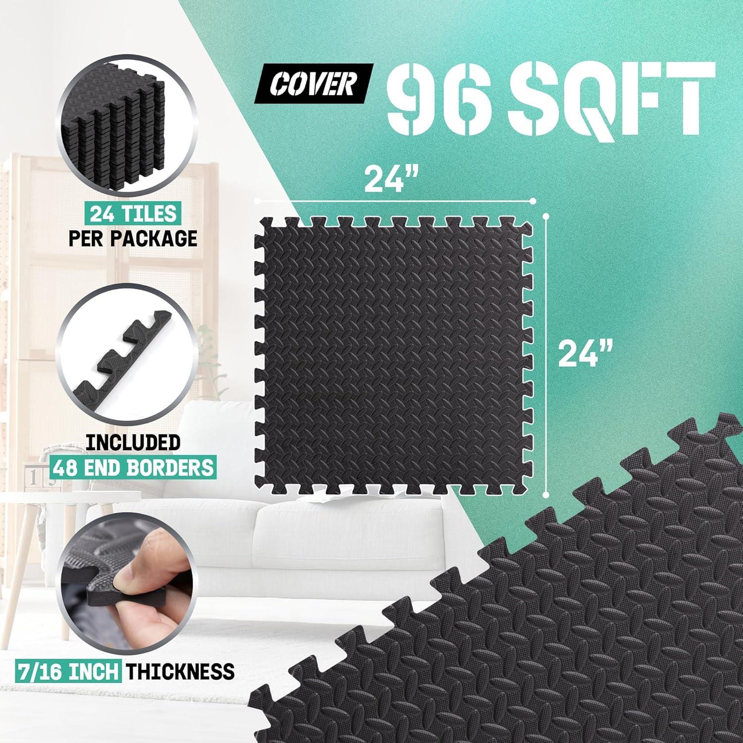 24 TILES COVER 96 SQFT: Each floor mat tile is 24″x24″ in size, they are designed to be assembled and customized easily, ideal for coverage in multiple spaces; With 7/16″ thickness, the interlocking mat provides a comfortable & innovative home flooring solution